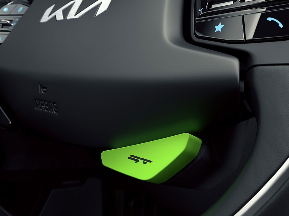 Nimm Platz in der speziell gestalteten GT-Kabine, die mit schlanken, sportlichen Akzenten begeistert. Insbesondere die Neon-Highlights auf den Sitzbezügen in Wildleder-Optik, das kunstvoll gestaltete „Geonic“-Oberflächendesign der Mittelkonsole und das GT-Logo auf dem Armaturenbrett machen das Interieur einzigartig.